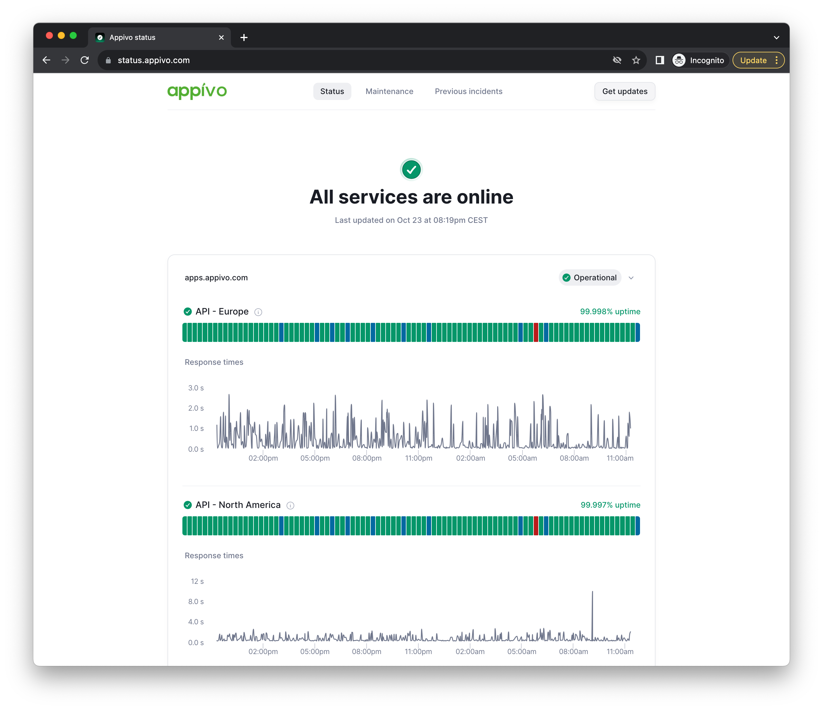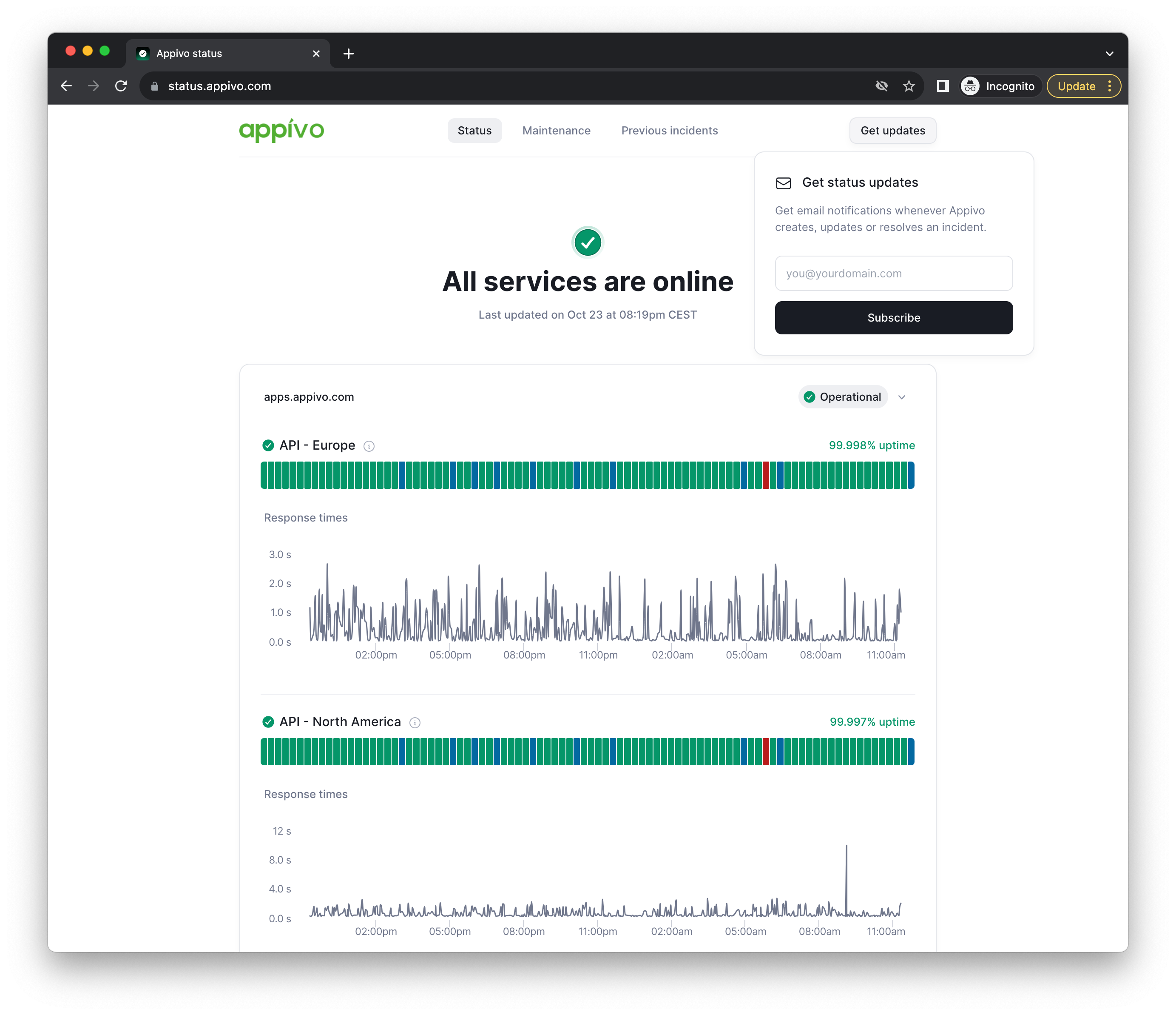 Probably not, unless maybe if there's a scheduled maintenance window. You can go to status.appivo.com to check the current status and subscribe to maintenance notifications.